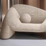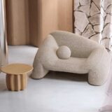 Upholstered in a textured beige fabric, the chair offers both aesthetic appeal and comfort. The wide, rounded arms and low profile invite relaxation, while the integrated spherical cushion enhances both the visual harmony and ergonomic support. It’s designed not just to be seen but also enjoyed.